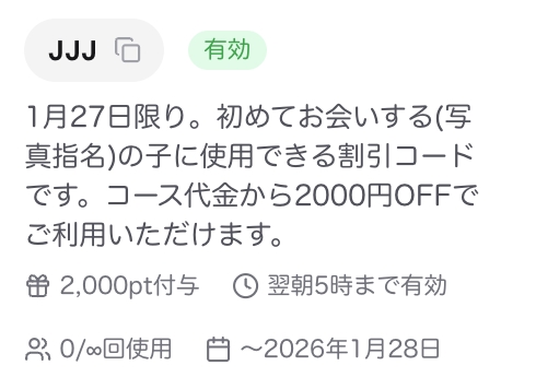 ※1日に2回以上割引を使用する場合は再度、取得と入力の必要がございます。