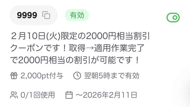 2月6日(金)限定の2000円相当割引クーポンです!