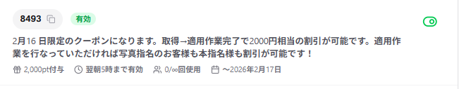 📅2月16日(月)当日限定の割引コードです!※本指名様も適用🉑
