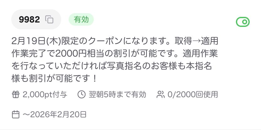 📅2月19日(木)当日限定の割引コードです!※本指名様も適用🉑
