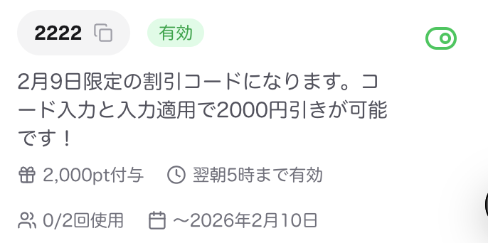 ※1日に2回以上割引を使用する場合は再度、取得と入力の必要がございます。ご相談くださいませ!